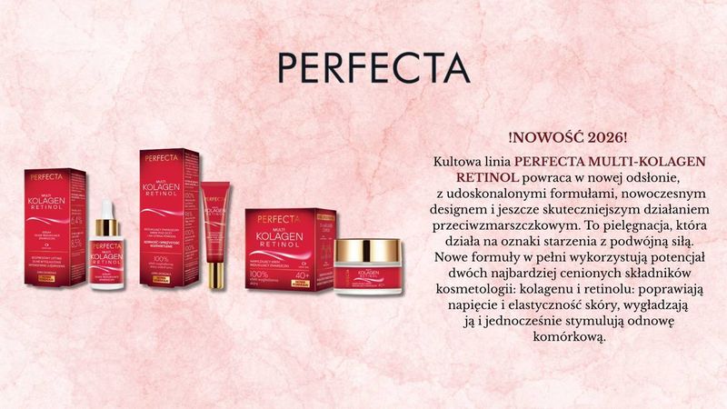 Kultowa linia PERFECTA MULTI-KOLAGEN RETINOL powraca w nowej odsłonie, z udoskonalonymi formułami, nowoczesnym designem i jeszcze skuteczniejszym działaniem przeciwzmarszczkowym. To pielęgnacja, która działa...