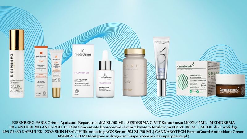 Serum do dojrzałej skóry: MEDIDERMA Fr – Antiox Md Anti-Pollution Concentrate – liposomowe serum z kwasem ferulowym, witaminami C i A oraz floretyną. Intensywnie naprawia podrażnioną skórę.