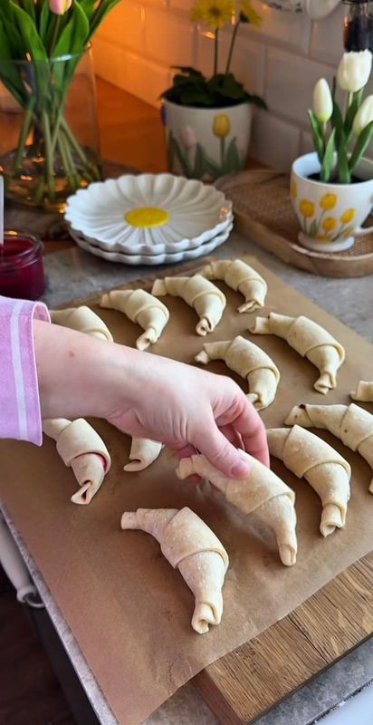 - Nałóż ulubione nadzienie (np. powidła śliwkowe z tartą czekoladą i konfiturą z róży), zwiń w rogaliki i piecz 25–30 minut w 180°C (góra-dół). Po upieczeniu można dodatkowo oprószyć je cukrem pudrem.