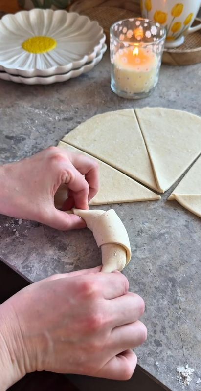 - Podziel ciasto na pół i schłodź przez 30 minut w lodówce. Następnie każdą część rozwałkuj na okrąg (ok. 28 cm średnicy) i podziel na 8 trójkątów.