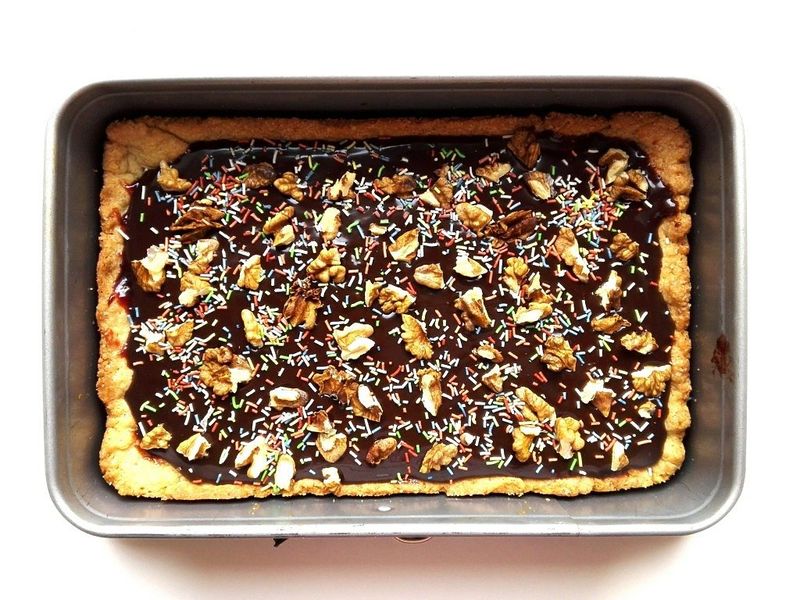 Wylej karmel na upieczony spód, posyp orzechami. Odstaw do ostygnięcia i lekkiego stężenia.