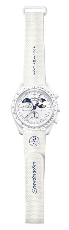 Logotypy OMEGA X Swatch zdobią tarczę i koronkę zegarka, natomiast na deklu koperty znajduje się wygrawerowane motto misji. Na pokrywie baterii widoczny jest wzór inspirowany Ziemią, natomiast biały gumowy pasek z rzepem VELCRO® stylowo uzupełnia całość.