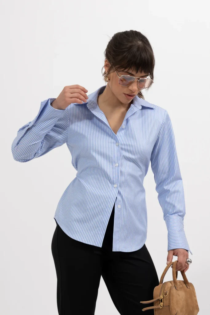 Estetyka office siren, która zdominowała media społecznościowe, ewoluuje w stronę bardziej dojrzałej elegancji. Centralnym punktem staje się koszula Bonnie, której konstrukcja skupia się na czystości formy i nowoczesnym modelowaniu sylwetki. Unikalnym rozwiązaniem w tym modelu jest wąski pasek, który można wiązać zarówno z przodu, jak i z tyłu. Ten detal pozwala na indywidualne dostosowanie stopnia taliowania i spektakularne podkreślenie wcięcia w talii. W przeciwieństwie do klasycznych, męskich krojów, Bonnie została zaprojektowana z myślą o krótszym korpusie, co eliminuje problem nadmiaru materiału i tworzy nieskazitelną linię ramion.