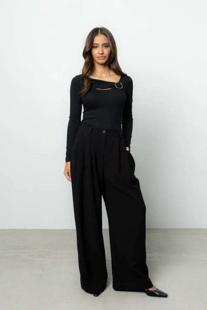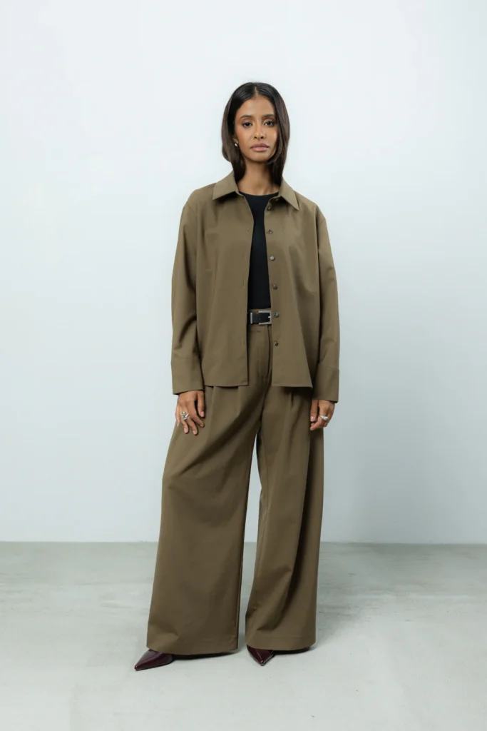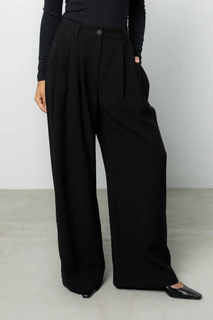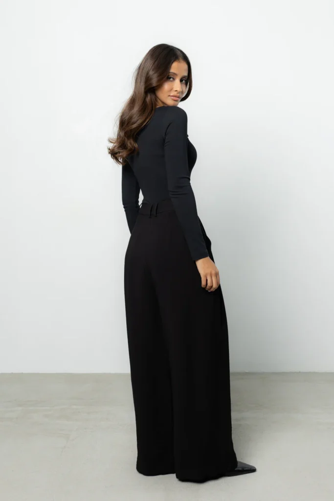 Dla zachowania równowagi w stylizacji, marka Blaar stawia na silny kontrast. Idealnym dopełnieniem dopasowanych gór są spodnie Sage, które stanowią hołd dla szlachetnego oversize’u. Ich szeroka nogawka i swobodny fason dają poczucie komfortu i stanowią idealną bazę stylizacji. Sage zostały zaprojektowane tak, aby mimo dużej objętości materiału, nie przytłaczać drobnej sylwetki – kluczem jest tu perfekcyjne dopasowanie w pasie oraz długość skrojona pod wzrost petite. To model dla kobiet, które kochają bawić się skalą i szukają nowoczesnego, miejskiego sznytu.