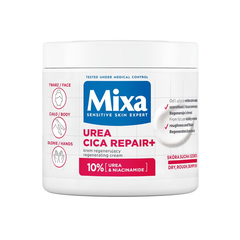 Pielęgnacja ciała jest dużo łatwiejsza niż twarzy. W jej przypadku nie mamy bowiem wieloetapowej rutyny. Tym bardziej warto znaleźć czas i na stałe wpisać ją do codziennego harmonogramu pielęgnacyjnego. Skóra odwdzięczy się za to. Sięgając po multifunkcyjny krem Mixa Urea Cica Repair+ można już od 1. użycia widocznie zredukować szorstkość i łuszczenie się skóry*, a także skutecznie ją zregenerować i ochronić na przyszłość. Za efekt odpowiada 10% formuła, którą tworzą: