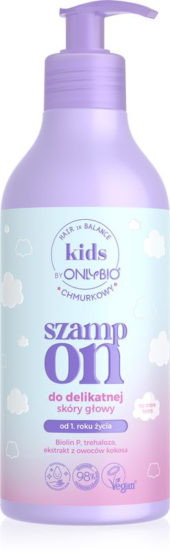 Chmurkowy szampon do codziennej czułości Hair in Balance KIDS by OnlyBio to delikatny kosmetyk przeznaczony do codziennej pielęgnacji wrażliwej skóry głowy dzieci. Jest delikatny, lekki jak… chmurka! Łagodnie oczyszcza wrażliwą skórę głowy, zapewnia świeżość i komfort każdego dnia. Idealny na początek przygody z samodzielnym myciem włosów. Piana jest przyjemna, otulający, słodki zapach pianek marshmallow, że sprawia, że codzienna pielęgnacja staje się przyjemnym i radosnym rytuałem. Formuła z prebiotykiem Biolin P, trehalozą oraz ekstraktem z owoców kokosa wspiera barierę ochronną skóry, pomaga utrzymać odpowiedni poziom nawilżenia i koi wrażliwą skórę głowy. Szampon nie szczypie w oczy, zawiera 98% składników pochodzenia naturalnego.