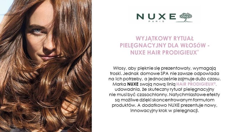 WŁOSY, ABY PIĘKNIE SIĘ PREZENTOWAŁY, WYMAGAJĄ TROSKI. JEDNAK DOMOWE SPA NIE ZAWSZE ODPOWIADA ICH POTRZEBOM, A JEDNOCZEŚNIE ZAJMUJE DUŻO CZASU. MARKA NUXE SWOJĄ NOWĄ LINIĄ HAIR PRODIGIEUX®, UDOWADNIA, ŻE SKUTECZNY RYTUAŁ PIELĘGNACYJNY NIE MUSI BYĆ CZASOCHŁONNY. NATYCHMIASTOWE EFEKTY SĄ MOŻLIWE DZIĘKI SKONCENTROWANYM FORMUŁOM PRODUKTÓW. A DODATKOWO NUXE PREZENTUJE NOWY, INNOWACYJNY KROK W PIELĘGNACJI.
